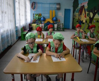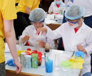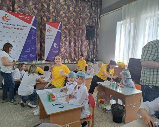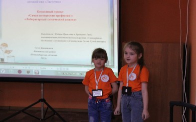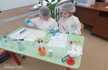 Нужно было научиться разбираться во многих вещах! Участники в спецодежде: халат, очки, перчатки. И хотя нашим «химикам» всего по шесть-семь лет, требования к выполнению заданий весьма серьёзные. Ведь нужно определить содержание витамина С в соках! Всё по-взрослому.